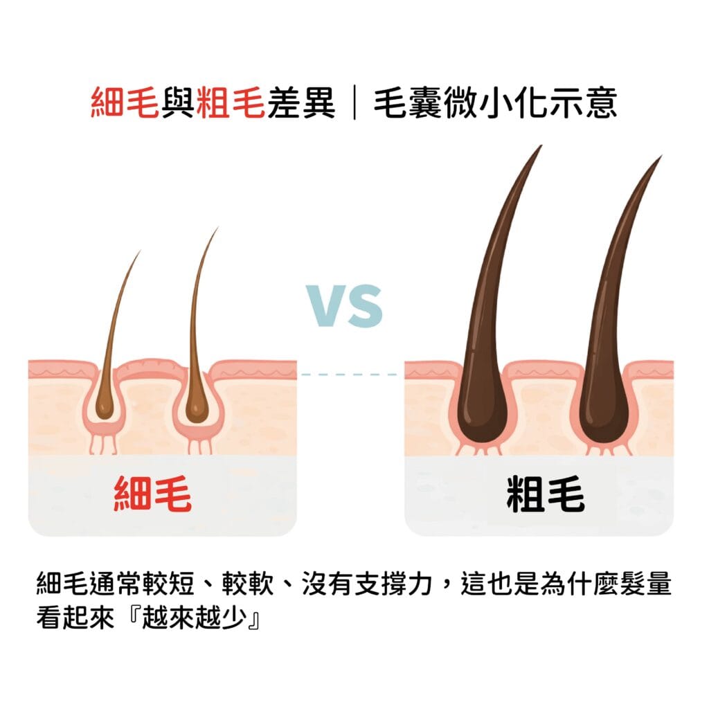 所謂毛囊微小化(Miniaturization),指的是毛囊逐漸縮小,導致頭髮越長越細。